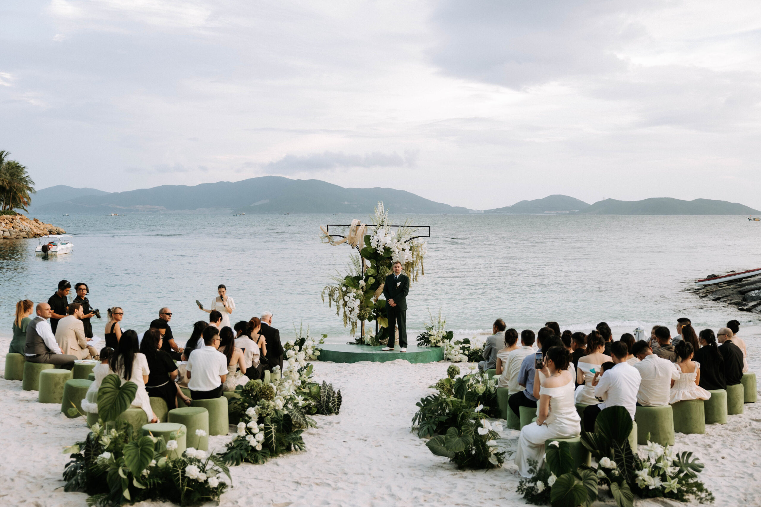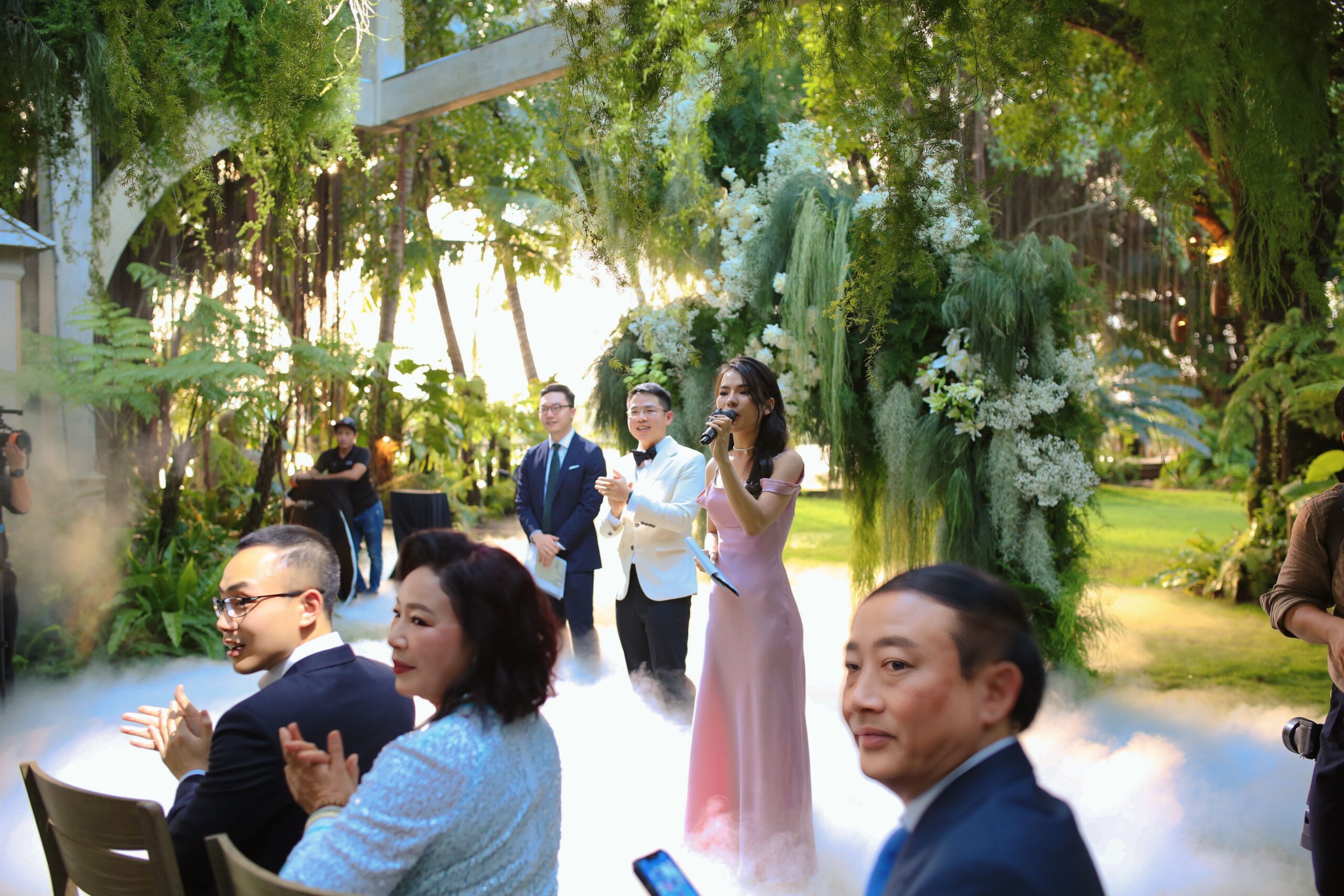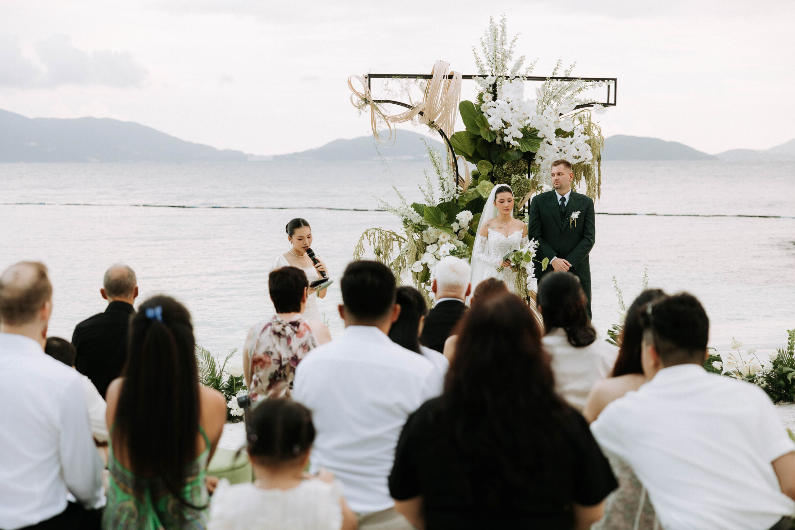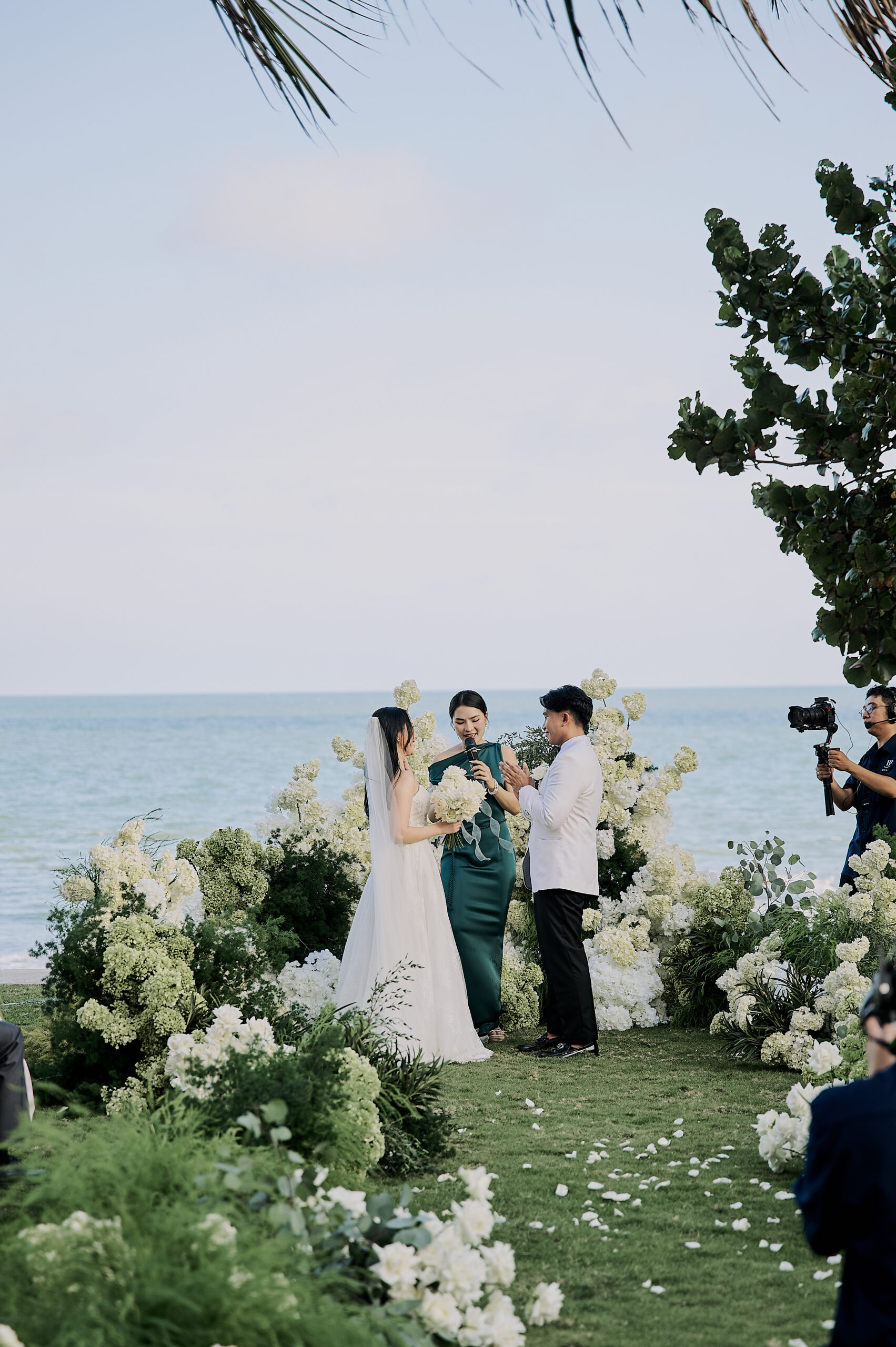 Leading the exchange of vows and rings with a personalized bilingual script and cultural integration. (This can also be co-officiated with a chosen friend of the couple for a more personal touch)